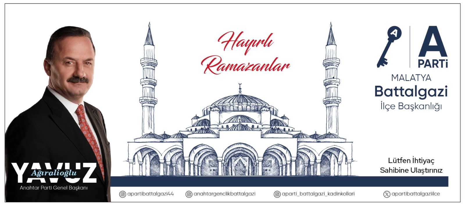 Anahtar Parti Battalgazi İlçe Başkanlığı, mübarek Ramazan ayının hayırlara vesile olmasını temenni ederek, vatandaşların huzur ve güven içerisinde bir Ramazan geçirmesi amacıyla kapsamlı bir gönül ve yardım seferberliği başlattı.