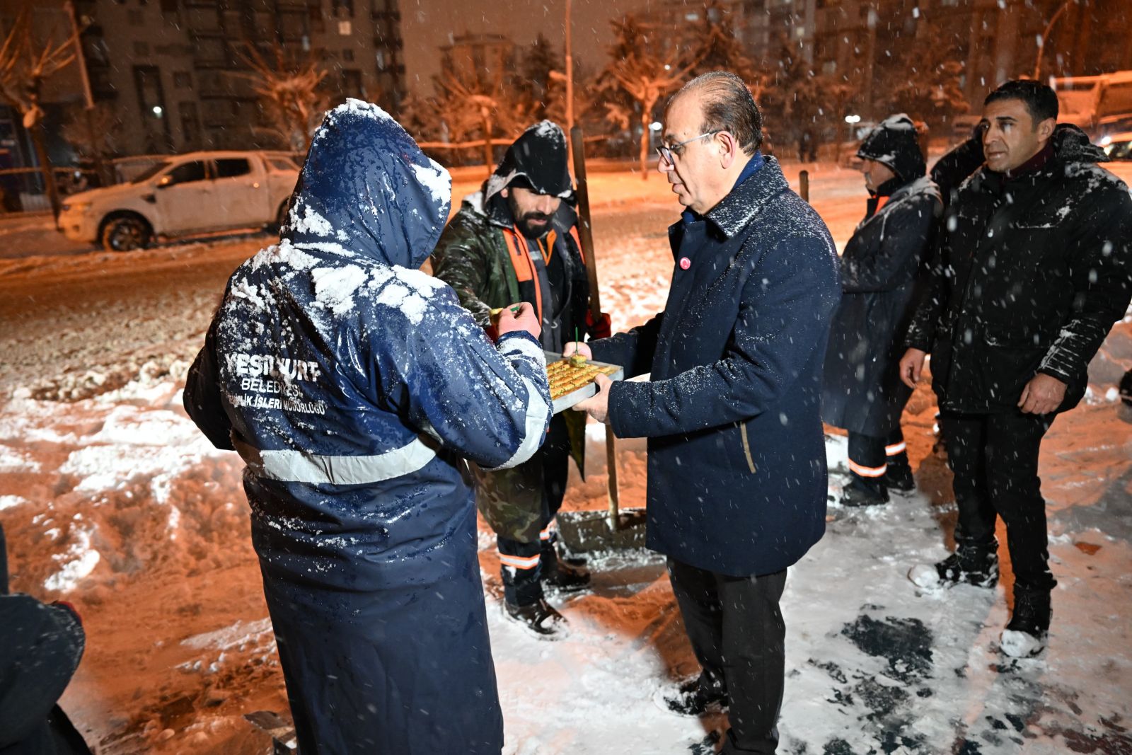 Başkan Geçit, günlerdir sahada yoğun bir mesai yapan personellere başarılar dileyerek tatlı ikramında bulundu.