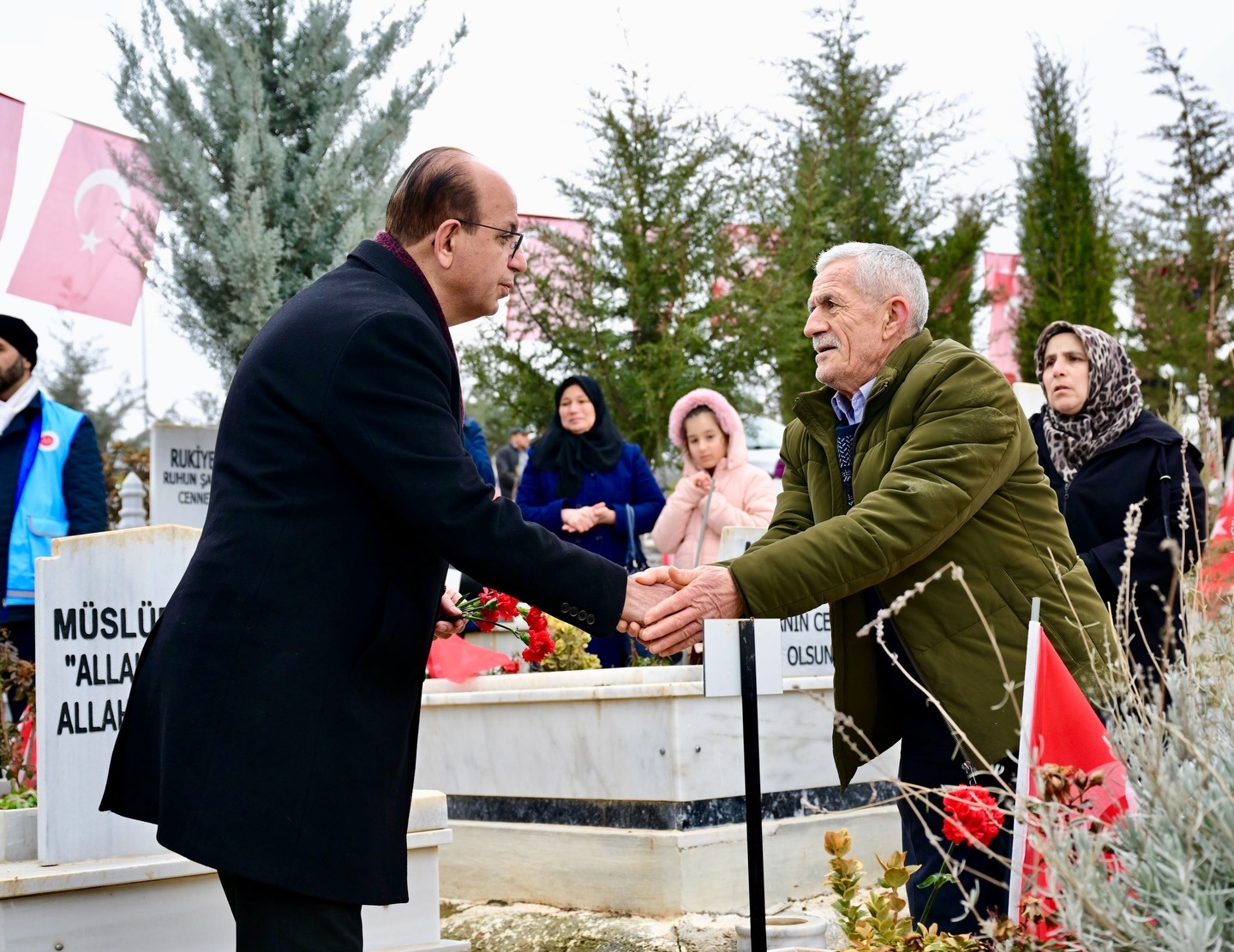 Gerçekleştirilen ziyarette, 6 Şubat depremlerinde hayatını kaybeden vatandaşlar dualarla anılırken, kabirlere karanfiller bırakıldı. Duygu dolu anların yaşandığı programda, depremde yaşamını yitiren tüm şehitler için Kur’an-ı Kerim okunarak dualar edildi.